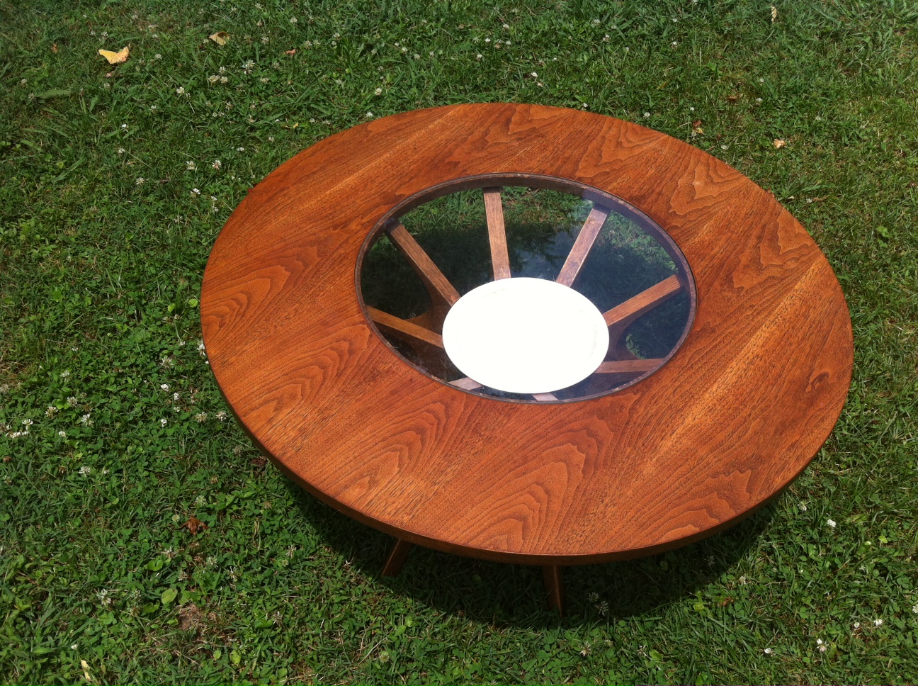 We love this walnut Brasilia glass top coffee table. The best part is that it has a the original planter in the middle, just perfect for succulents or any other low maintenance plant. Measures 40″ in diameter and 16″ in height.