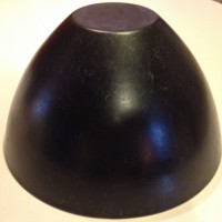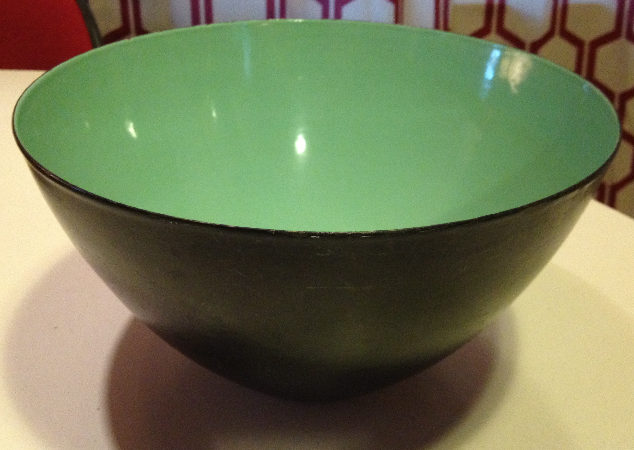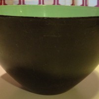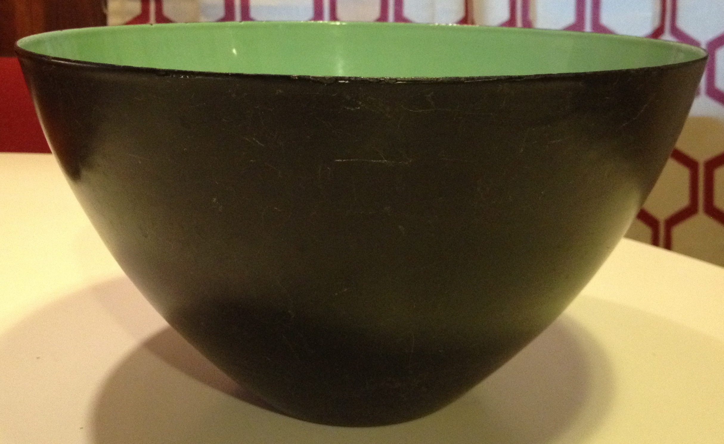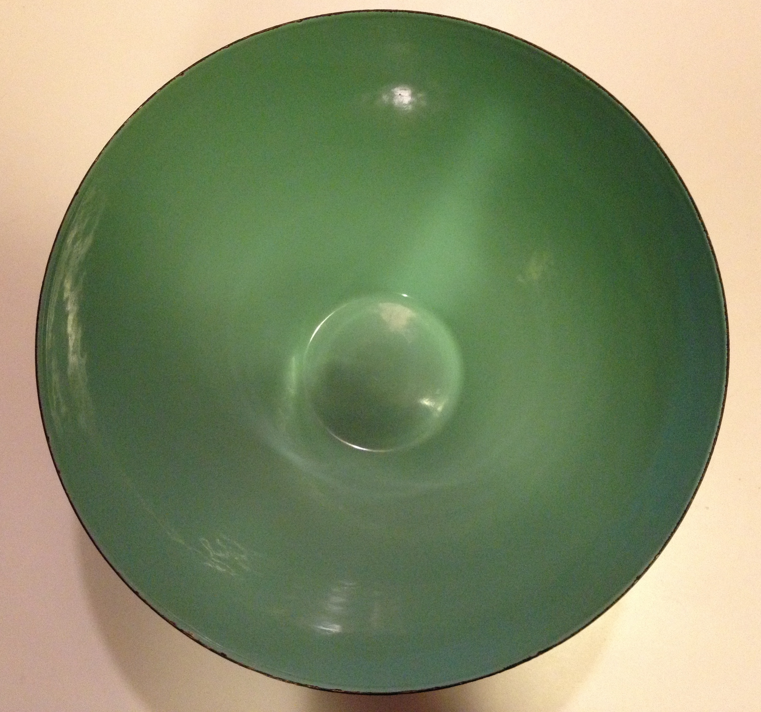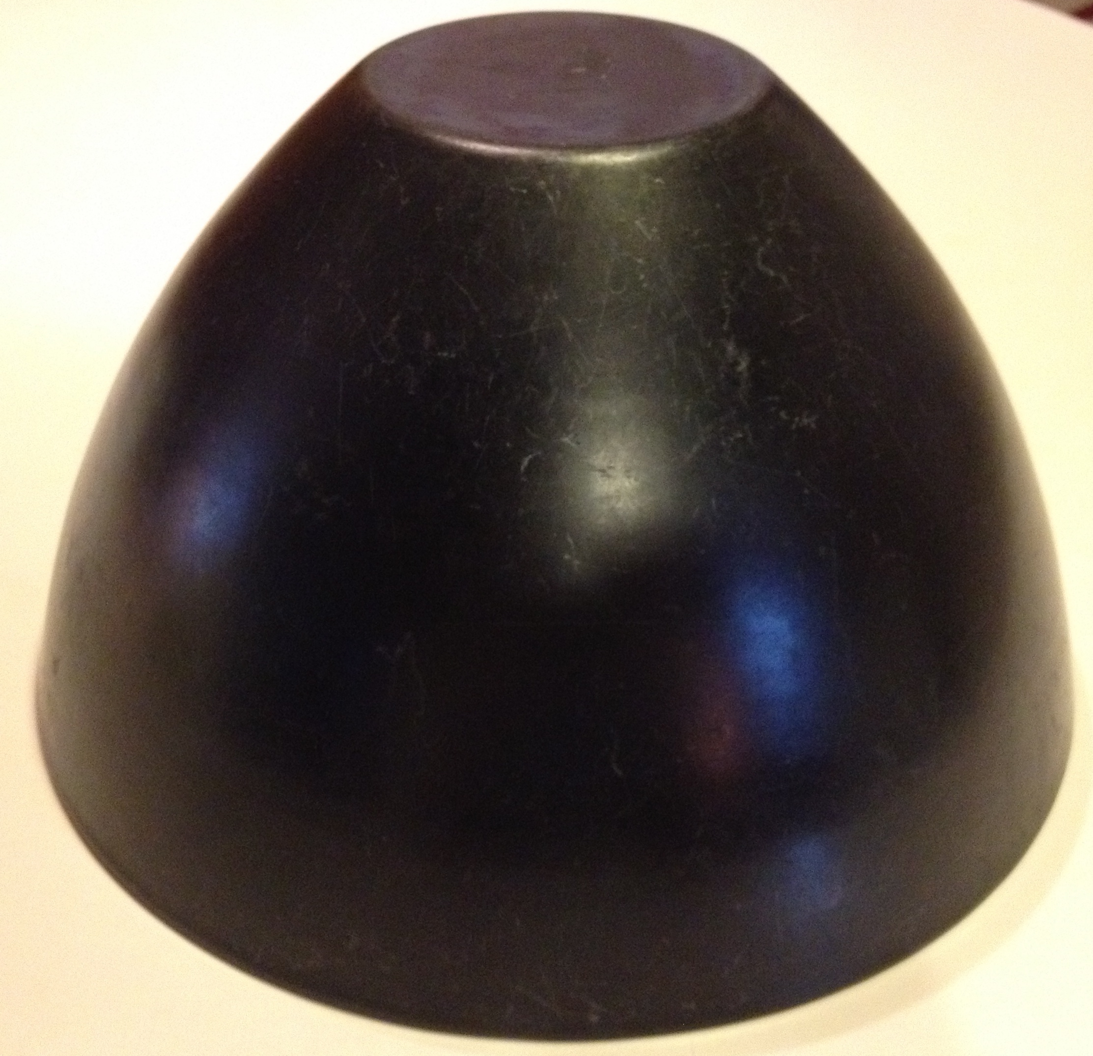 The interior is actually slightly more blue than the lighting in the photo suggests. The matte black exterior has the expected wear marks for something this old, but as far as these bowls go it is in great vintage shape with barely any dings around the edges.